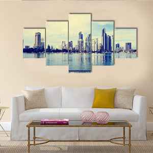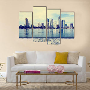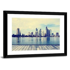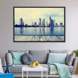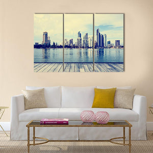 Modern Buildings Of Gold Coast depicts a calm coastal cityscape with a waterfront skyline, pier and wooden planks in the foreground. The photographic, slightly vintage palette of blues, tan, grey and white creates a serene, urban mood that suits coastal or modern interiors.