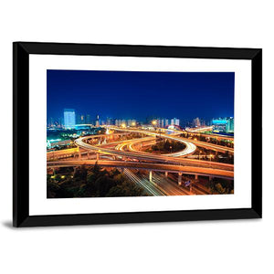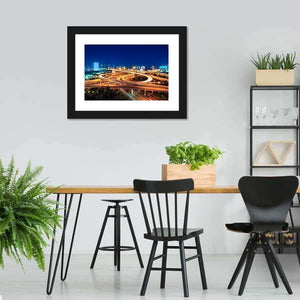 This vibrant cityscape features a photorealistic view of a highway interchange and city skyline, illuminated against the night sky. With a dynamic palette of blue, orange, and yellow, it captures the energetic essence of urban life.