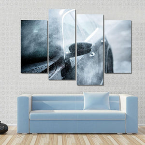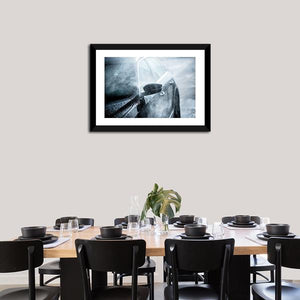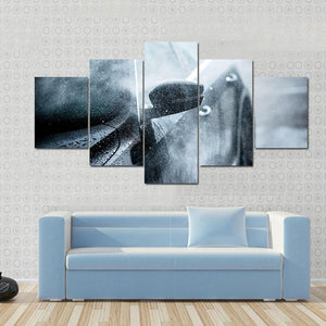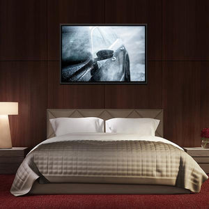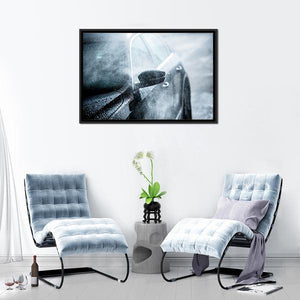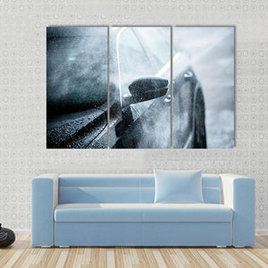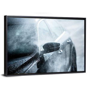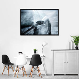 This canvas artwork captures the dynamic interplay of a car covered with water splashes, creating a clean and modern aesthetic. The close-up composition showcases vibrant droplets against a palette of black, white, blue, and gray, making it a striking addition to any contemporary space.