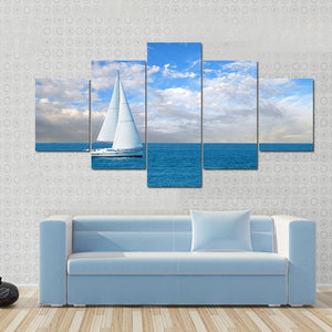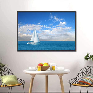 This captivating canvas art features a two-masted sailboat gliding across a tranquil ocean under a serene sky filled with fluffy white clouds. Its calming blue and white palette creates a peaceful atmosphere, making it a beautiful addition to any room.