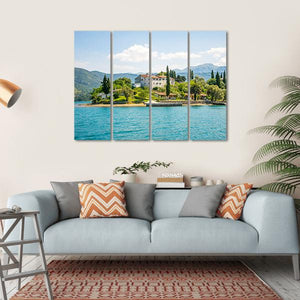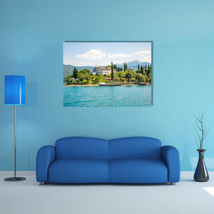 This captivating canvas print features the serene Monastery of St Michael, showcasing its picturesque white buildings with red roofs amidst tall green trees and calm blue water. Ideal for evoking a vacation vibe in your space.