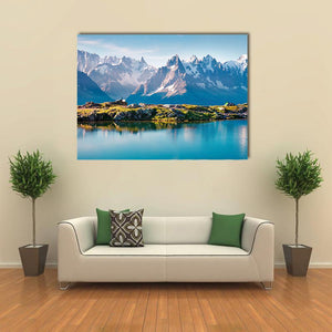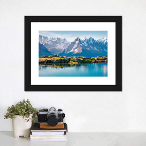 This canvas art showcases majestic snow-capped mountains reflecting in a serene lake bordered by rocky shores and green grass. The realistic depiction invites a sense of adventure and tranquility, making it a perfect addition to your nature-themed decor.