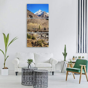 Monte Rosa Mountain Vertical Canvas presents snow-capped mountains and leafless trees beneath a clear blue sky in a vertical panorama with layered perspective. This nature photography print reads as serene and rugged, with blue, white, brown, green, and gray tones that highlight rocky ground and winter mountain scenery. It pairs well with modern or nature-inspired room decor.