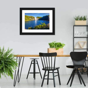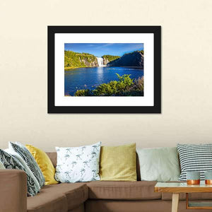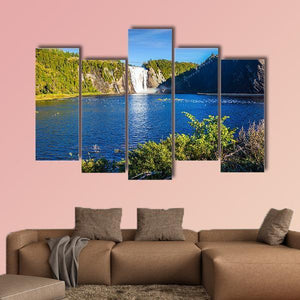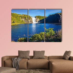Montmorency Falls Canvas Wall Art presents a photorealistic view of a waterfall and river set among cliffs and dense forest, with sunlight catching the water. Cool blues and greens and bright highlights give a serene, majestic feel that works well in modern, nature-inspired home decor.