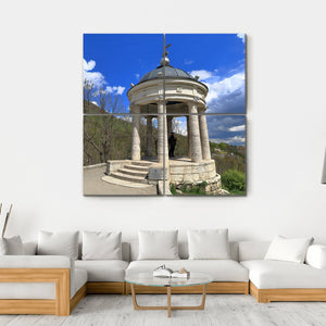 This landscape canvas features a serene white gazebo nestled among green treed hills under a cloudy sky. It brings a peaceful and scenic touch to your space, ideal for anyone looking to enhance their home decor with a realistic portrayal of nature.