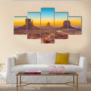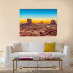 Monument Valley At Dawn presents Monument Valley’s buttes and a winding desert road in crisp, photorealistic detail. A blue and warm orange-red palette with a rule-of-thirds composition creates a majestic, serene sense of depth that fits modern home decor.