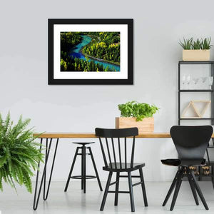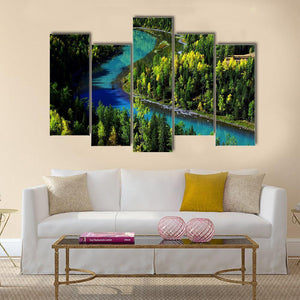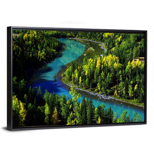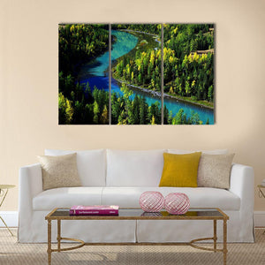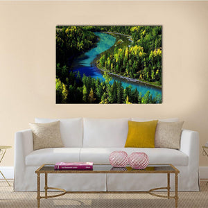 A high-angle landscape showing a winding turquoise river cutting through dense forest and mountains, highlighted by vibrant autumn foliage. The realistic, autumnal scene feels serene and majestic and works well in nature-themed or modern rooms.