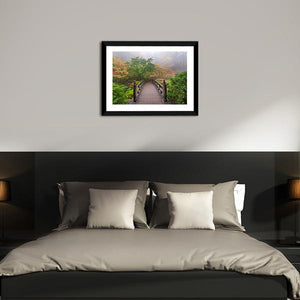 This serene canvas art features a wooden bridge embraced by vibrant autumn foliage and gentle fog. The tranquil scene invites a sense of calm, making it an ideal addition to any peaceful space.