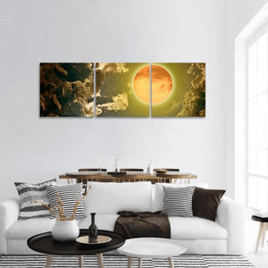 Moon In Dark Clouds Panoramic Canvas presents a glowing orb — a moonlike planet set among dark, textured clouds in orange, yellow, brown, and white tones. The image feels dramatic, cosmic, and ethereal in an abstract modern style and works well as wall décor for contemporary living rooms or offices.