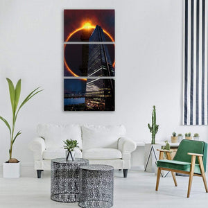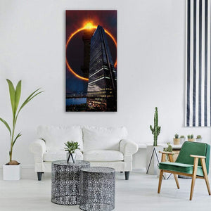 A ring-of-fire eclipse hangs over a lighthouse and city skyline, with water and skyscrapers creating depth and asymmetry. The orange, blue, black, white, and yellow palette gives the scene a dramatic, surreal night mood that fits modern urban interiors and contemporary rooms.