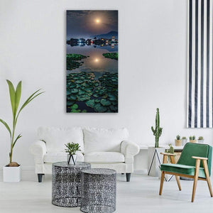 A realistic landscape featuring moonlight on a pond, dense lily pads in the foreground, and distant city lights reflected on the water. The rule-of-thirds composition and a palette of blues, greens, yellows, and white give the scene a tranquil, magical feel. Ideal for modern or nature-inspired rooms that want a calm, scenic focal piece.