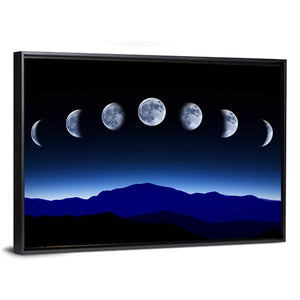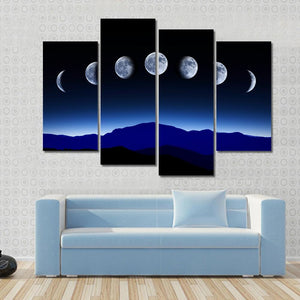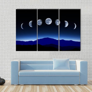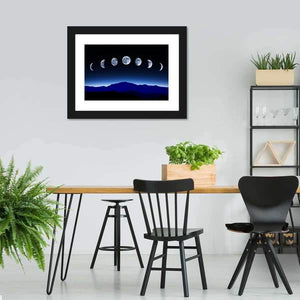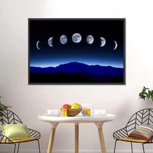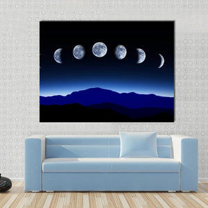 This landscape canvas art beautifully depicts the seven distinct phases of the moon against a tranquil night sky and majestic mountains. With its serene blue, black, and white palette, it's a perfect addition to enhance your room's modern décor.