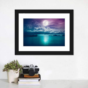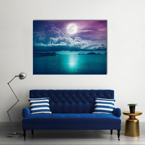 This canvas features a serene scene of a full moon reflecting on calm ocean waters, accompanied by dramatic clouds and a long pier. Its soothing palette of blues, purples, and whites evokes a peaceful, mystical atmosphere, making it a beautiful addition to any modern décor.