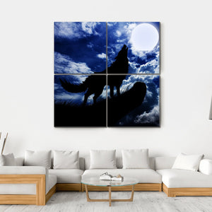 This striking canvas features a wolf howling under a full moon, silhouetted against a dramatic night sky filled with billowing clouds. The artwork evokes a mysterious, wild atmosphere, perfect for adding depth to any room.