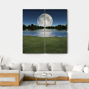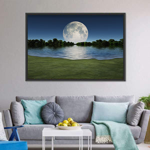 This artwork depicts a full moon rising over a tranquil lake, reflecting on the water amidst serene trees and grass. Its calm and peaceful vibe makes it a wonderful addition to any nature-inspired space.