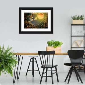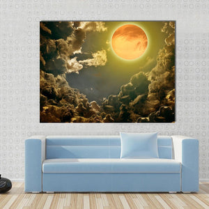 This canvas art captures a mesmerizing scene of a glowing moon shrouded by dark, stormy clouds. The dramatic lighting and deep hues merge in breathtaking harmony, creating an atmosphere of mystery and awe.