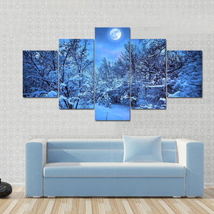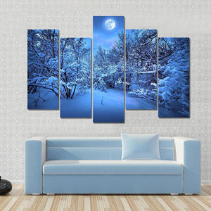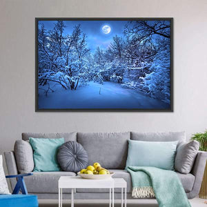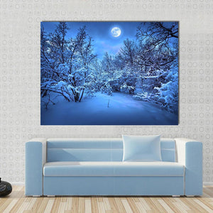 This captivating canvas art features a serene snowy forest path illuminated by a bright full moon. With bare trees framing the scene under a starry sky, it evokes a cold yet enchanting atmosphere.