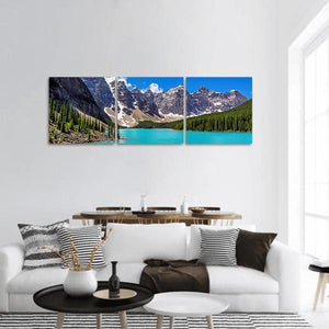 Turquoise Water Of Moraine Lake shows a photorealistic view of a turquoise lake bordered by snow-capped, rocky peaks and a dense pine forest. The wide, panoramic composition creates layered depth and a serene, majestic mood. Suited to modern or nature-inspired interiors as a calming focal piece.
