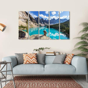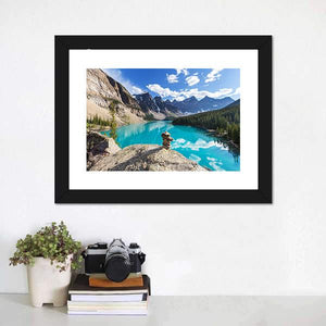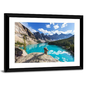 This canvas art captures the serene beauty of Moraine Lake in Banff National Park, showcasing majestic mountains, a vibrant turquoise lake, and a tranquil sky dotted with clouds. The composition invites a sense of peace, making it an ideal addition to nature-inspired decor.