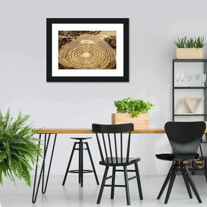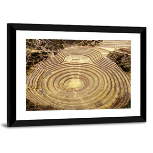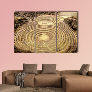 This canvas shows the Moray Quechua site in Peru with concentric circular terraces carved into a hillside. Warm earth tones and an aerial, symmetrical view create an ancient, agricultural mood that suits rustic or modern room decor.