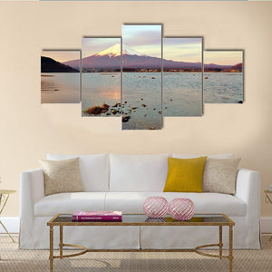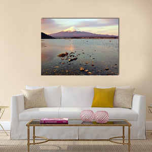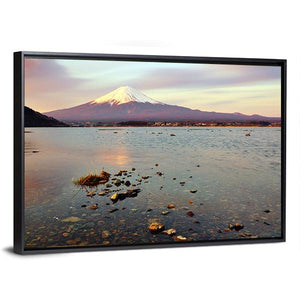 This canvas artwork captures the serene beauty of Mount Fuji, showcasing a breathtaking view of the snow-capped mountain, calm waters, and a tranquil shoreline. The peaceful palette of blues, whites, and soft pinks brings a sense of majesty to any space.