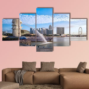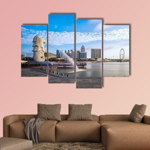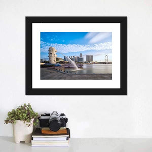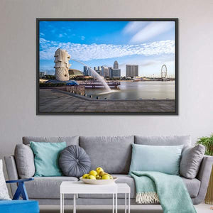 Featuring the Merlion statue against Singapore’s skyline, this photorealistic canvas captures the fountain’s spray, clouds and modern buildings in an iconic daytime city scene. The palette of blue, white, gray and green and a rule-of-thirds composition make it well suited to modern or coastal-themed room decor.