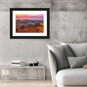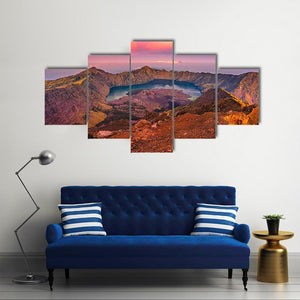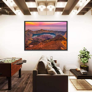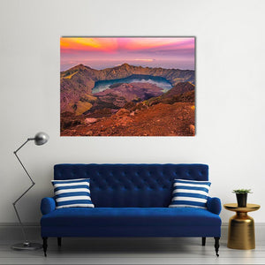 Rinjani Mountain Morning Canvas Wall Art presents a high-angle aerial view of a volcanic crater and lake framed by surrounding mountains and a dramatic dawn or dusk sky. The blue, orange, pink and brown palette and vibrant, scenic style create a majestic, serene atmosphere that suits modern living rooms and bedrooms.