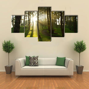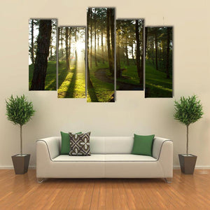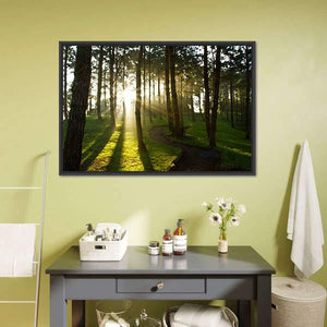 This serene landscape art features a tranquil forest path illuminated by sunlight filtering through the pine trees. The realistic depiction captures soothing shades of green, brown, and gold, making it a perfect addition to nature-inspired decor.