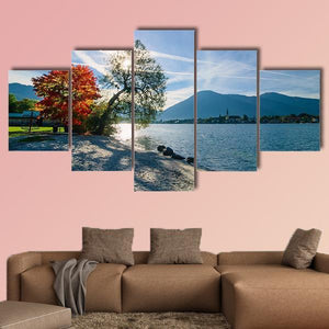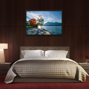 A peaceful, photorealistic landscape of a lake at sunrise, with mountains, shoreline and a single tree showing orange foliage. Sunlight filters through the branches and wispy clouds cross the sky, giving a calm, nature-inspired accent for modern rooms.