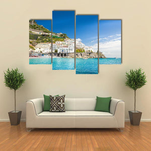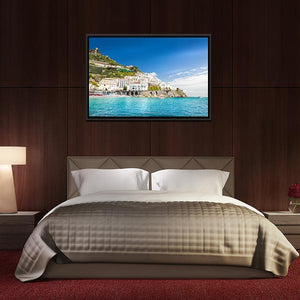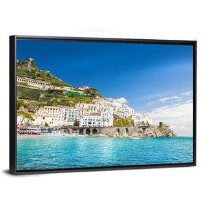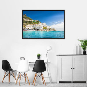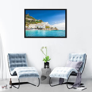 A photorealistic view of the Amalfi Coast showing white buildings cascading down cliffs to bright blue water beneath a clear summer sky. Vibrant, sunny, and serene, the scene captures a daytime coastal town and open ocean. It suits modern or coastal-style rooms and brings a calm, seaside atmosphere to living rooms or entryways.