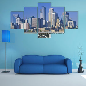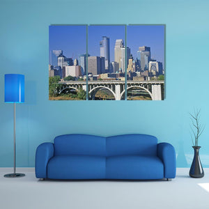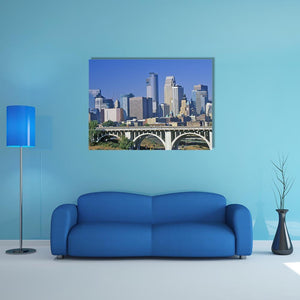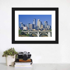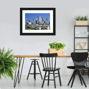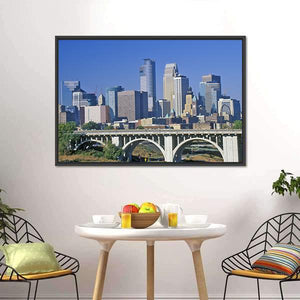 This striking canvas print showcases the iconic Minneapolis skyline, featuring a stunning arched bridge over a river. The bright and sunny atmosphere captures the essence of urban life, making it a great addition to any contemporary decor.