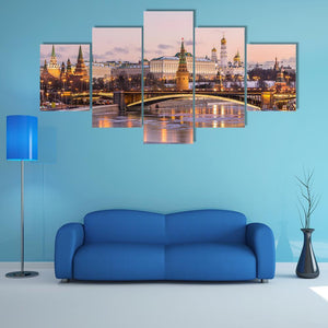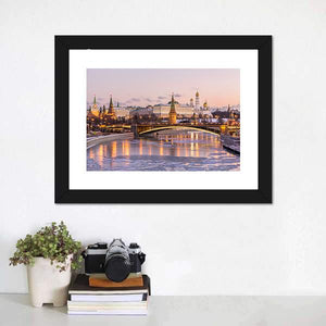 A photorealistic canvas of the Moscow Kremlin skyline at twilight, where domed buildings glow gold against a purple and blue sky and streetlights reflect on an icy river. Its calm, illuminated scene suits modern living rooms or entryways.
