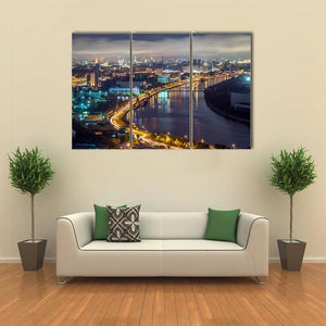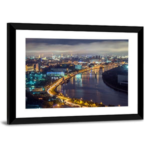 This vibrant canvas captures a stunning aerial view of Moscow's cityscape at night, showcasing the shimmering river and glowing city lights. The modern artwork brings an urban flair, making it a fitting addition to any contemporary room decor.