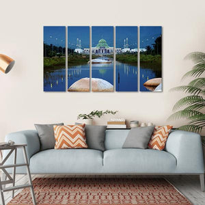 This canvas artwork features a stunning mosque in tranquil Natuna, surrounded by calm water, rocks, and trees. The serene palette of blue and green evokes peace, making it a beautiful addition to your wall decor.
