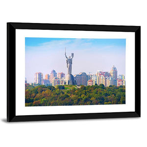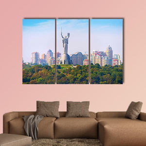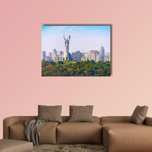 This canvas features the Motherland statue in Ukraine framed by a distant city skyline and scattered trees, shown in a wide, aerial-style view. Realistic tones of blue, green, white and a touch of pink give the scene an urban, iconic, scenic mood that fits modern home or office wall decor.