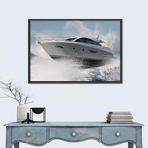 This dynamic canvas piece features a yacht leaping over ocean waves, capturing a sense of fast-paced excitement. The vivid palette of white, blue, and grey brings to life the splashing water and bright blue sky, making it an engaging focal point for any room.