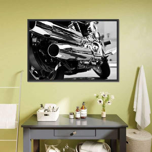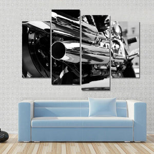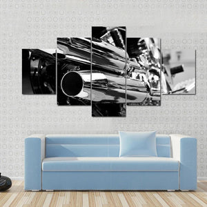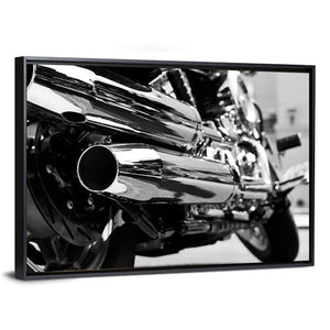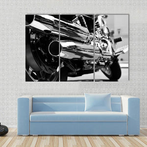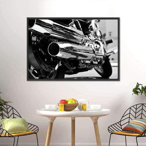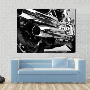 This striking canvas artwork features a close-up view of motorcycle exhaust pipes and wheels, showcasing a powerful and sleek aesthetic. The black and silver palette adds a metallic touch, making it a perfect addition to modern and industrial-themed spaces.