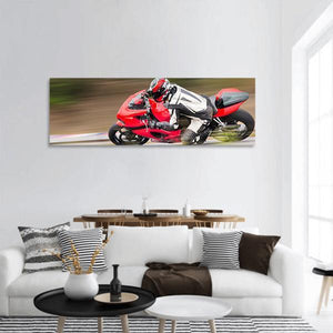 Featuring a motorcycle racer on the track, this panoramic canvas captures speed and action with motion-blurred background for a dynamic, realistic feel. Bold reds, blacks, greens and whites emphasize movement and energy. Suited to contemporary interiors and automotive-themed rooms.
