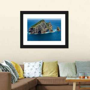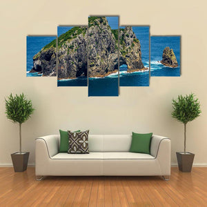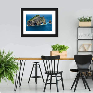 Motukokako Island Canvas Wall Art depicts the island’s rock arch and the surrounding ocean set in New Zealand, rendered in a naturalistic, photorealistic approach. Cool blues, greens and grays with water spraying around the rocks create a serene, majestic mood that fits coastal or modern rooms.
