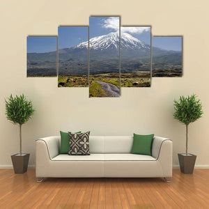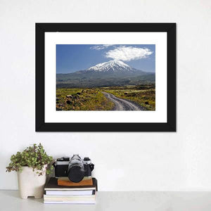 This serene landscape art captures the majestic Mount Ararat, with its snow-capped peak looming over a winding gravel road and soft fluffy clouds. The realistic portrayal in shades of green and blue makes it a beautiful addition to any room decor.