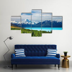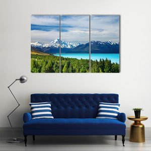 Experience the serene beauty of New Zealand with this stunning landscape art featuring snow-capped mountains and a turquoise lake. Its majestic composition captures the natural charm of a pined shoreline under a partially cloudy sky.
