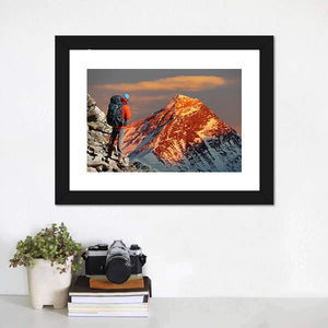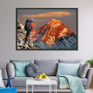 Experience the breathtaking beauty of Mount Everest as seen from Gokyo Valley. This canvas artwork captures a moment of adventure, showcasing a mountain climber among rocky terrain bathed in the warm hues of sunset. The serene palette of orange, blue, and gray makes it a striking addition to your wall decor.