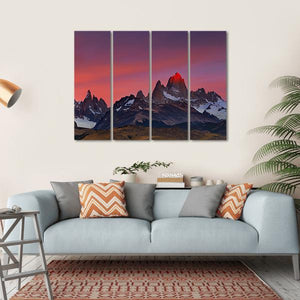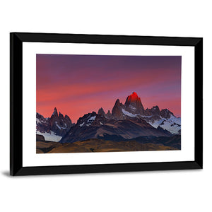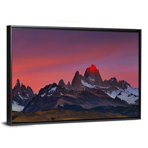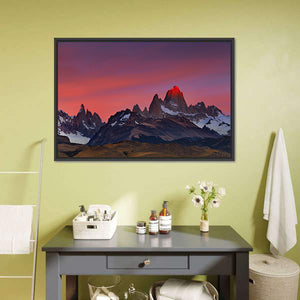 Experience the serene beauty of the Mount Fitz Roy mountain range at sunset. This captivating canvas art captures the dramatic hues of red, purple, and brown, with snow-capped peaks illuminated by the fading light. It's an ideal piece for those looking to bring a touch of nature into their living space.