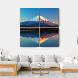 Capture the serene beauty of Mount Fuji and Lake Shoji with this stunning canvas wall art. The realistic depiction features a snow-capped mountain reflecting in the calm waters at sunset, creating a tranquil atmosphere perfect for any space.