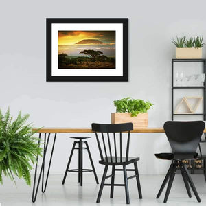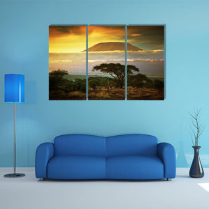 This canvas art showcases the majestic Mount Kilimanjaro at sunset, surrounded by acacia trees and a warm savanna landscape. Its serene colors bring a peaceful and inviting atmosphere to any space.