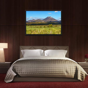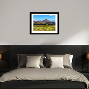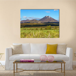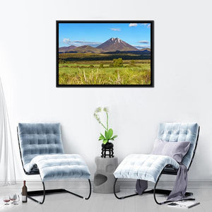 Photorealistic view of Mount Ngauruhoe in Tongariro, New Zealand, showing a snow-capped volcano, layered grasslands, and a wide sky with puffy white clouds. The clear horizon and foreground grasses give the scene a peaceful, serene, and majestic mood. A nature-focused piece that suits modern living rooms or rooms with natural decor.