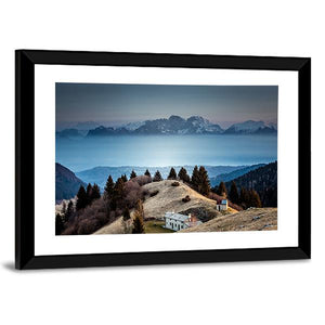 A realistic landscape of the Mount Schiara Dolomite peaks showing layered mountains, misty valleys and a small house with a red roof. Cool blues, greens and soft greys create a serene, peaceful mood that feels vast and calm. Suits modern room decor and nature-focused interiors.