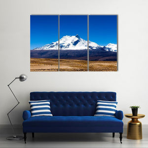 Mt Shishapangma, China is presented as a realistic landscape: a sunlit, snow-capped peak rises over barren plains beneath a clear blue sky. The rule-of-thirds composition and a palette of white, blue, brown and tan create a vast, serene, majestic mood that suits modern or nature-inspired rooms.