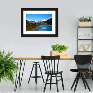 Mountain Above Lake features a lake framed by snow-capped mountains, a dark rocky shoreline and a hint of road under a clear blue sky, rendered in a realistic nature-photography style. Its blue-green palette and rule-of-thirds composition create a serene, majestic mood that fits modern living rooms and bedrooms as calming wall decor.