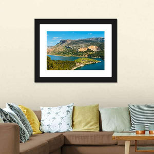 Mountain & Lake Spain Canvas Wall Art depicts a serene lakeside landscape with mountains, an island and lush trees beneath a bright blue sky. The rule-of-thirds composition, visible rocky cliffs and layered vegetation create depth while the blue, green and tan palette keeps the mood peaceful and natural. It suits modern or nature-inspired living spaces, such as living rooms and bedrooms.